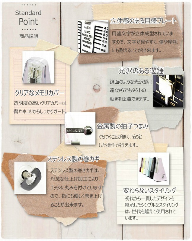 一番の特徴は『音だけでなく視覚的にも拍子を捉えることができる』こと。また、『カチカチと音がはっきりと聞こえる』こと。そして、『ぜんまい式のため、電池交換が不要』であること。このシンプルな要素が、ニッコースタンダードの人気の秘密です。